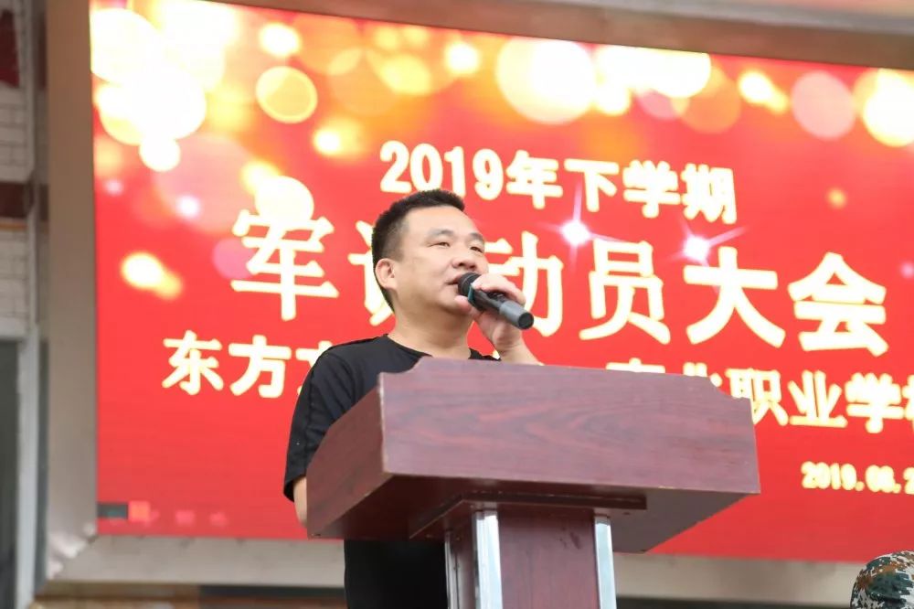 秦志飞主任讲解军训各注意事项,教练员代表和学生代表分别表明决心,校长伍胜勇宣布军训开始。